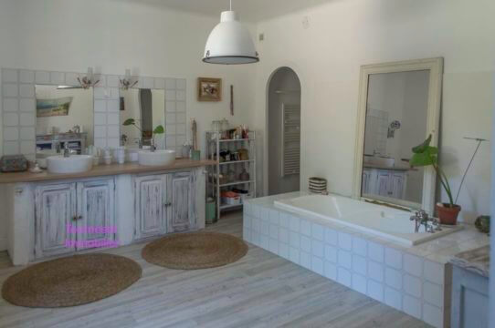 Un charme fou pour cette maison de village de 350 m2 rénovée dans un style country house chic. Une belle entrée dessert un salon avec insert, une très belle pièce de vie avec accès direct sur la terrasse, une cuisine équipée avec accès sur la terrasse également, une buanderie, un dressing et des toilettes séparées.