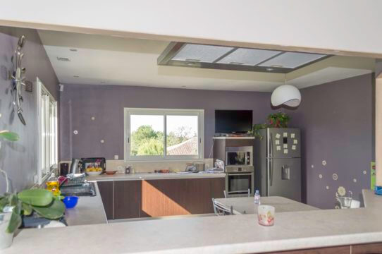De belles prestations pour cette grande villa de plain pied de 170 m2 avec une jolie vue dégagée. Une entrée dessert une belle pièce à vivre de 67m2 avec une spacieuse cuisine américaine équipée, 4 chambres dont 1 avec un point d’eau, 1 grande salle de bains avec baignoire d’angle et douche à l’italienne, 2 wc. Chauffage par le sol.