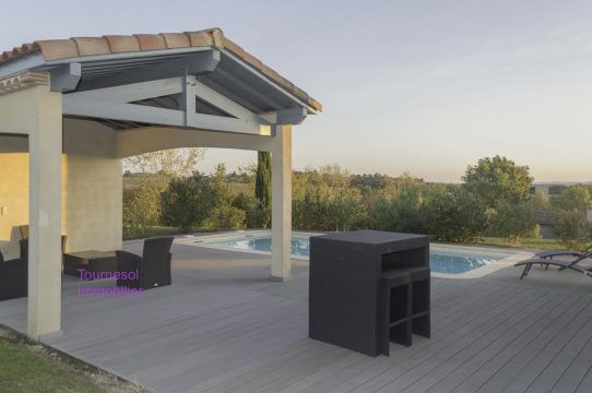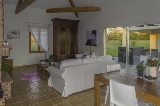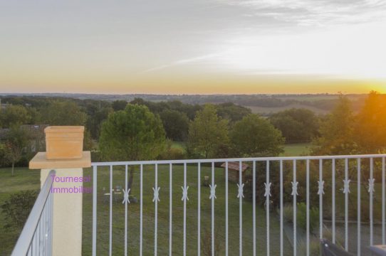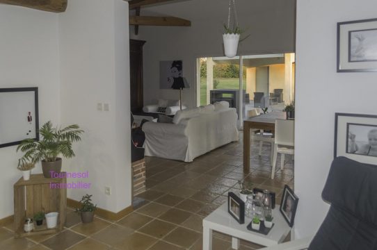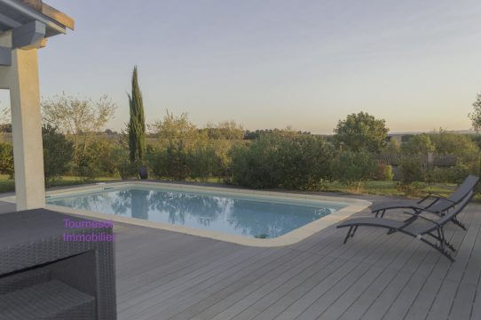 Toute proche de Mauvezin une belle et vaste villa de charme en parfait état. De plain pied une belle entrée dessert un double séjour avec cheminée avec accès direct sur la terrasse et le très cosy espace piscine. Cuisine équipée, cellier, 3 chambres parquetées, salle de bains et toilettes séparées . Le 1er étage est consacré à l’espace parents avec une jolie suite composée d’une grande chambre parquetée avec terrasse privative offrant une jolie vue sur la campagne, d’un dressing, d’une salle d’eau et de toilettes séparées.