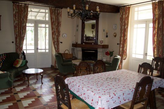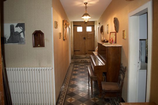 Le couloir du rez de chaussée dessert un agréable séjour avec une cheminée, une cuisine, une chambre, une salle d’eau et des toilettes.
