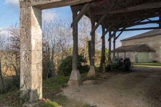 De belles dépendances sur le terrain de 2 ha (pigeonnier, grange ouverte, garage et cave) ainsi qu’une jolie piscine adossée à la roche.